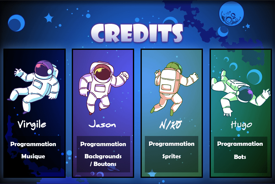Jeu réalisé dans le cadre du projet tutoré de S2 en groupe de 4 étudiants, il reprend les concepts de Bomberman avec le thème de l'espace.