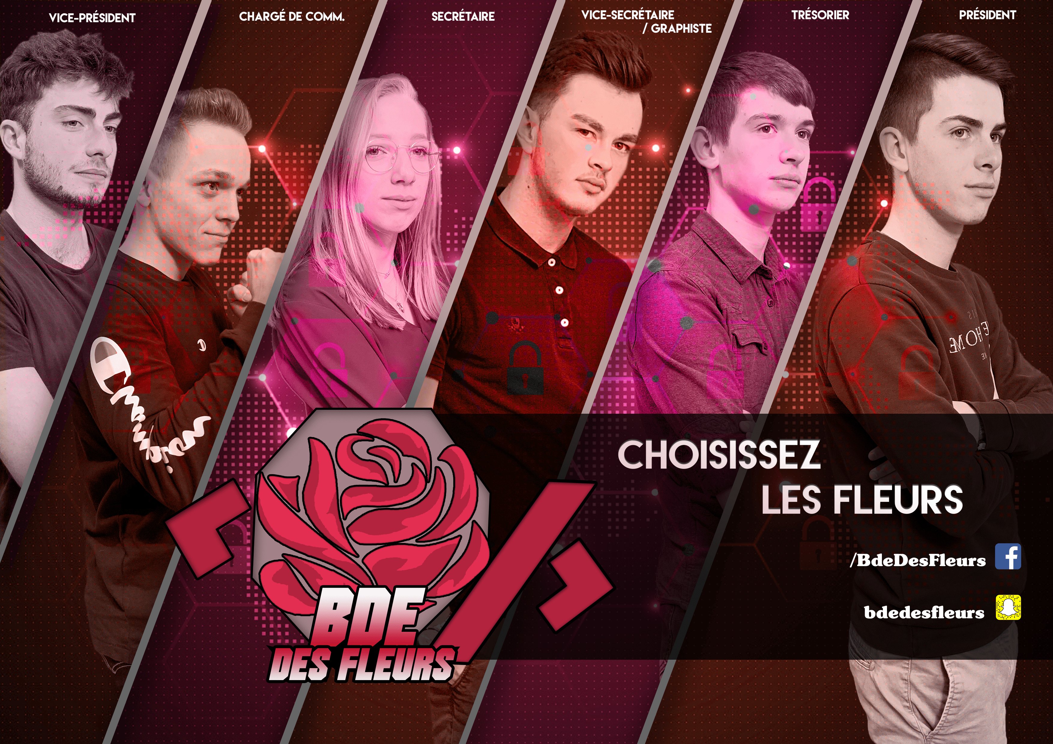 Différentes affiches et flyers réalisés en tant que graphiste du BDE Informatique "BDE Des Fleurs" de l'IUT de Lens.